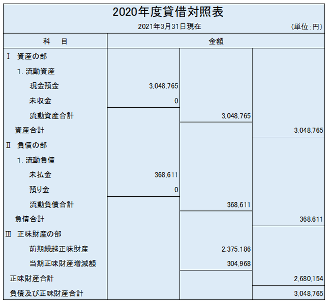 お知らせ · 14日 6月 2021 令和2年度(2020年度)事業会計に係わる貸借対照表 2021年6月11日ITC近畿会通常総会にて2020年度会計報告が承認されました。 特定非営利活動促進法(NPO法)の規定、および、ITC近畿会の規約にもとづき、ホームページ上に2020年度の貸借対照表を公告します。 tagPlaceholderカテゴリ: