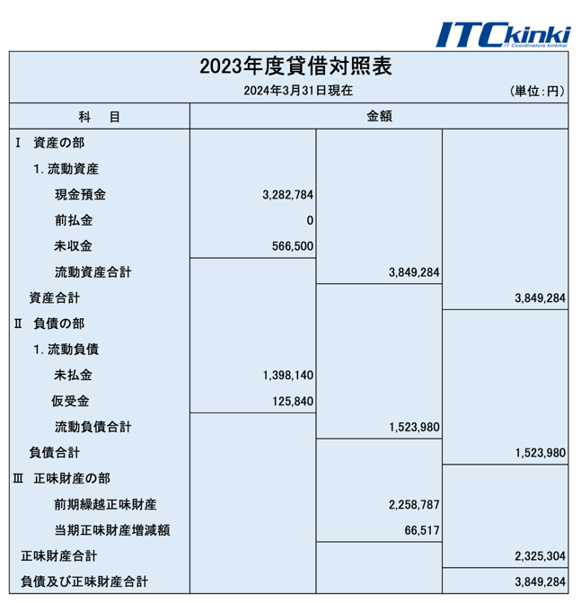 2024年6月8日ITC近畿会通常総会にて2023年度会計報告が承認されました。 特定非営利活動促進法(NPO法)の規定、および、ITC近畿会の規約にもとづき、ホームページ上に2023年度の貸借対照表を公告します。